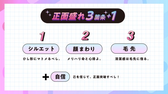 続いて、「#正面盛れスタイリング」講座では、人気ヘアスタイリストの力丸朋子さんが登壇。第一印象をアップさせるためのヘアスタイリングポイントを「正面盛れ3箇条」として紹介。シルエット・顔まわり・毛先のスタイリングが印象を大きく左右すると語りました。全体をひし形のシルエットにまとめることや、あほ毛・パヤ毛をおさえること、毛先に動きのある束感を出すことが好印象スタイリングのポイントだと説明しました。