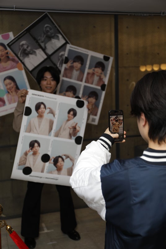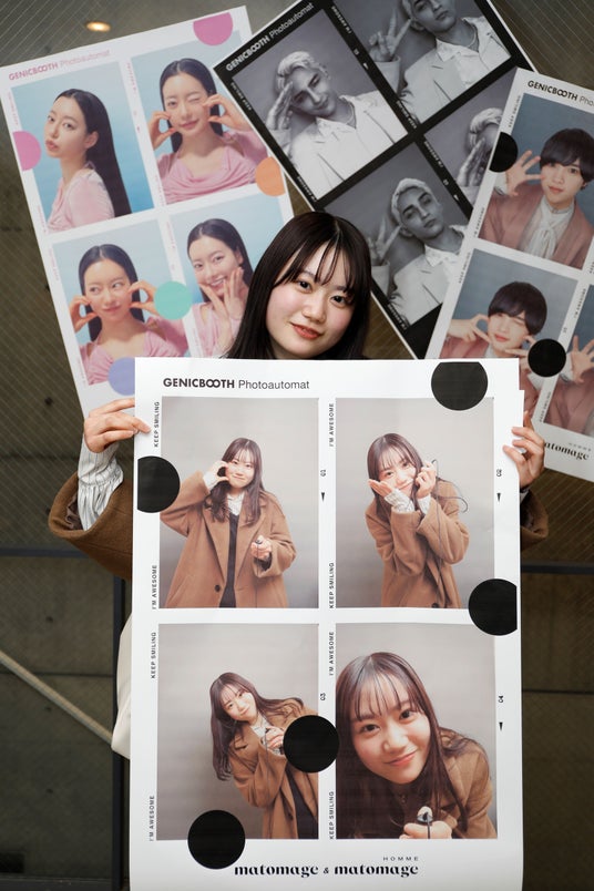 マトメージュ、マトメージュオムのアイテムでばっちりヘアスタイルがきまった後は、韓国でも人気の4分割プリント機で、オリジナルの”正面”写真撮影を体験いただきました。さらに本イベントでは撮影データはその場でA1サイズの巨大プリントに!来場者は巨大プリントを持った姿をスマホで撮影し合って体験を楽しまれていました。