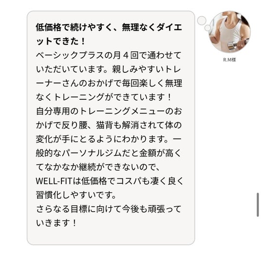トレーナーさんはとても明るくていつも励ましてくれるので諦めずにここまで来れました。何よりも楽しく通えています。
