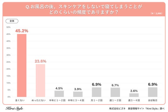 全国の20代~50代の女性2,000人を対象に、「お風呂の後、スキンケアをしないで寝てしまうことが どのくらいの頻度でありますか?」というアンケートを実施したところ、最も多かった回答は「全くない」で45.2%、次いで「めったにない」が23.6%という結果になり、約7割の方が日頃からスキンケアを徹底していることが分かりました。