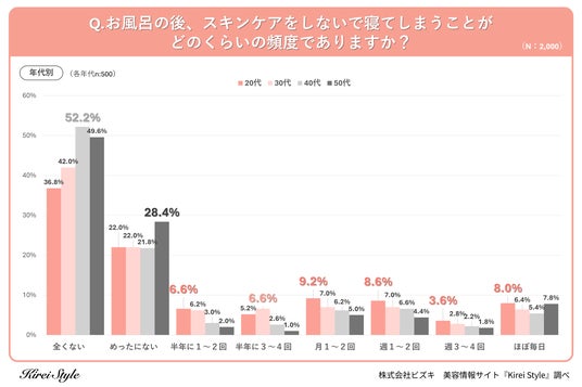 入浴後スキンケアをせずに寝てしまうことがある人は若年層ほど増加する結果に!20代では約4割が該当