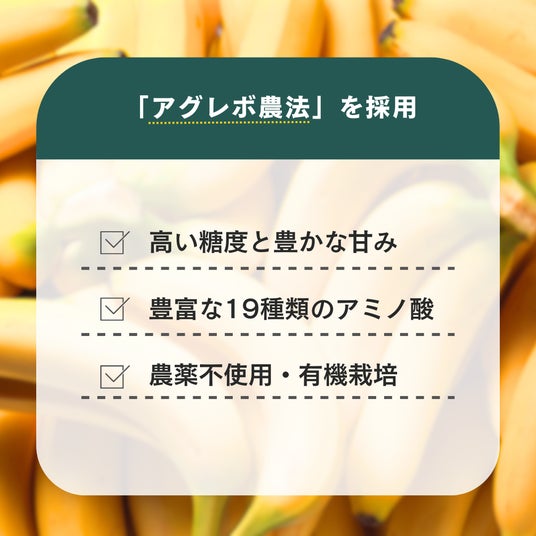 神バナナは農薬不使用の「アグレボ農法」によって育てられ、アミノ酸をはじめとする豊富な栄養素がしっかり含まれています。