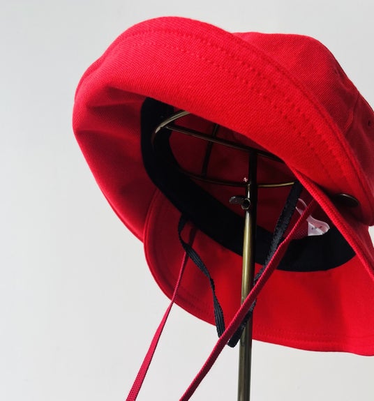前後2枚のつばを隙間なく重ね合い、額の周りを深い角度でぐるりと包んだ特徴的な形状