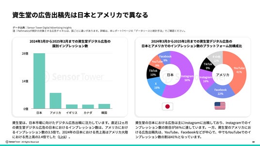 資生堂はデジタル広告を出稿することで、中心の日本市場を安定させると同時に、積極的にアメリカおよびヨーロッパにおける市場シェアを拡大しています。直近12ヵ月において、資生堂の日本におけるデジタル広告のインプレッション数は、アメリカにおけるインプレッション数の3.5倍に達しています。また中核ブランドに狙いを定めてInstagramを中心に広告出稿しており、Instagramでのインプレッション数の割合が56%に達しています。