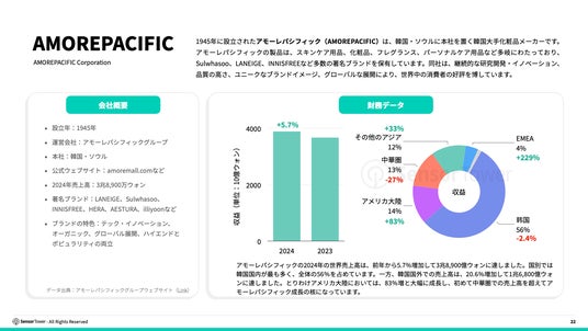 アモーレパシフィックは韓国の大手化粧品メーカーで、Sulwhasoo、LANEIGE、INNISFREEなど多数の著名ブランドを保有しています。アモーレパシフィックの2024年の世界収益は、アメリカ大陸での売上高の大幅な増加を受け、前年から5.7%増加して3兆8,900億ウォンに達しました。