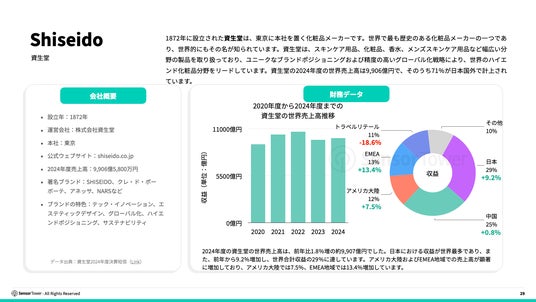 資生堂は世界で最も歴史のある化粧品メーカーの一つで、2024年度の世界売上高が前年から1.8%増加して9,906億円に上っています。その収益は、日本が世界最多であり、世界合計収益の29%に達しています。アメリカ大陸およびEMEA地域での売上高が顕著に増加しており、アメリカ大陸では7.5%、EMEA地域では13.4%増加しています。