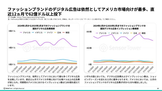 いずれの国においても、デジタル広告費およびインプレッション数は、ショッピングシーズンを迎える11月に最多となります。アメリカにおいては、11月のファッションブランドのデジタル広告費が9月から35%増加しました。