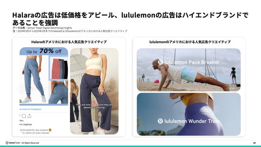 Halaraの価格設定は、lululemonなどの人気ブランドよりも強く顧客を引き付ける力があります。そのため、lululemonの広告クリエイティブが製品と運動のマッチング性を強調してハイエンドブランドの特性を押し出しているのに対し、Halaraの広告クリエイティブは、低価格および割引をアピールしています。