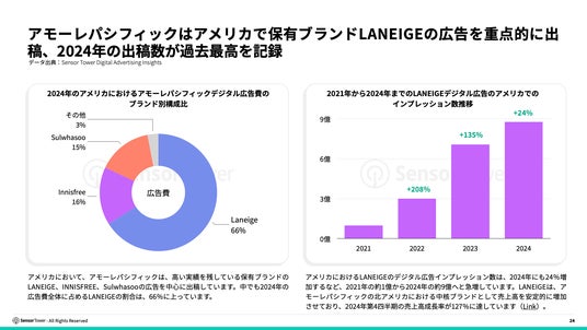 アモーレパシフィックは、アメリカにおいて保有ブランドLANEIGEに的を絞って広告を出稿しており、その2024年のアメリカでのデジタル広告費は、アモーレパシフィックが同年にアメリカで投じた広告費の66%を占めています。アモーレパシフィックの年次レポートによると、LANEIGEはアメリカにおけるデジタル広告のインプレッション数の急増に合わせ、アメリカでの売上高も増加が続き、2024年第4四半期には127%増加しています。