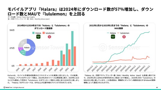 Halaraはモバイル市場急成長期のビジネスチャンスを確実に捉え、オンライン販路を積極的に拡大しています。2021年1月にリリースされた『Halara』アプリのダウンロード数は急増し続けており、2024年にさらに57%増加して、同年の『lululemon』のダウンロード数の1.8倍の540万に達しました。国別では、主要市場のアメリカで50%以上がダウンロードされています。月間アクティブユーザー数(MAU:Monthly Active Users)も急増し続けており、2025年1月には前年同月の1.5倍近くまで増加して2025年1月の『lululemon』の5.2倍に達しています。