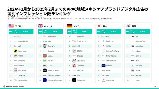 消費財ブランドとして世界的に有名な花王は、品質重視の姿勢およびイノベーション能力の高さによって世界中の消費者の好評を博しています。花王は、2024年3月から2025年2月までの日本における広告インプレッション数が最も多いAPACスキンケアブランドになっています。また、アメリカ、イギリス、ドイツにおいても広告のインプレッション数が際立っており、これら3ヵ国においてAPAC地域スキンケアブランドランキングでトップ3に入っています。
