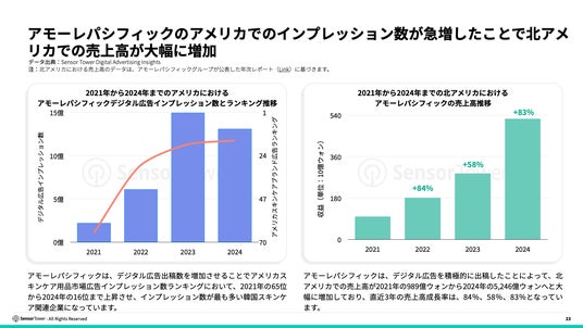 アモーレパシフィックは、デジタル広告出稿数を増加させることでアメリカスキンケア用品市場広告インプレッション数ランキングにおいて、2021年の65位から2024年の16位まで上昇させ、インプレッション数が最も多い韓国スキンケア関連企業になっています。アモーレパシフィックは、デジタル広告を積極的に出稿したことによって、北アメリカでの売上高が2021年の989億ウォンから2024年の5,246億ウォンへと大幅に増加しており、直近3年の売上高成長率は、84%、58%、83%となっています。