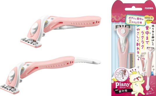 ピアニィ背中用「ピアニィ」シリーズより、ボディと背中のムダ毛処理がこれ1本で完結する2WAY仕様のカミソリです。背中の毛は自分では見えにくく、処理が難しい部分ですが、「ピアニィ背中用」は、持ち手を伸ばせる設計になっており、簡単に背中全体をケアすることができます。さらに、フェザー独自の刃技術により、肌に優しく、なめらかに剃れる仕様になっています。