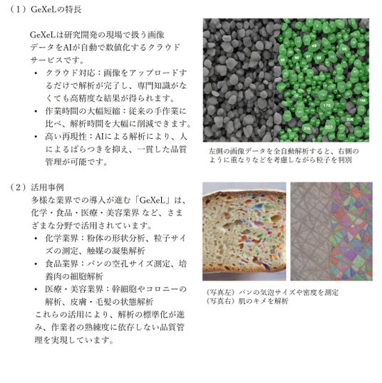 「研究・製造の現場を革新する新技術」として、当社は2024年7月にAIを活用した画像解析サービス 「GeXeL」 を開始しました。従来、研究者や熟練作業者が手作業で行っていた画像解析を、数クリックで自動化できる画期的なサービスです。