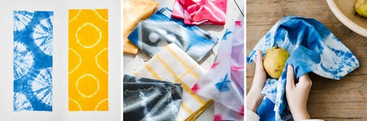 付属の手ぬぐいを折りたたんでから染料に漬けて染めます。1回に2色の染料が届くので、お好きな色を選んだり、配色を楽しむこともできます。毎回2種類の模様の染め方をご紹介しているので、お好きな方を選んでください。仕上がりは布を開いてみてからのお楽しみです。