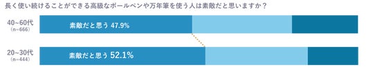 - 「長く使い続けることができる高級なボールペンや万年筆を使う人は素敵だと思う」の項目に対し、「はい」は40~60代では 47.9%でしたが、20~30代は52.1%と半数を超える結果となりました。