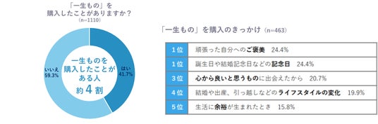 3.「一生もの」を購入した経験がある人は約4割。購入きっかけは「自分へのご褒美」が1位に。 経験がない人も、約半数が「今後購入したい」と回答し、メンタル面への良い影響を期待する声も。