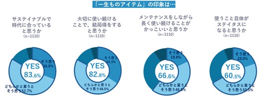 2.「一生ものアイテム」について、「大切に使い続けることで結局得をする」とコスパ意識の点でメリットを感じている人や「サスティナブルで時代に合っていると思う」という人は8割以上。ステイタスに感じる人や、メンテナンスをしながら使い続けることに魅力を感じる人も多数。