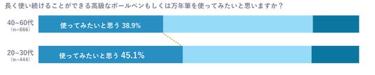 - 「長く使い続けることができる高級なボールペンもしくは万年筆を使ってみたいと思う」の項目に対し、「はい」は40~60代では 38.9%でしたが、20~30代は45.1%と6ポイント以上差がつきました。