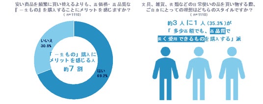 「安い商品を頻繁に買い替えるよりも、高価格・高品質な『一生もの』を購入することにメリットを感じますか?」という質問に対し、「はい」が69.2%という結果に。約7割の人が「一生もの」の購入に価値を見出していることがわかりました。また、「文具、雑貨、衣類などの日常使いの品を買い物する際、ご自身にとっての理想はどちらのスタイルですか?」という質問では、約3人に1人(35.3%)が「多少高額でも、高品質で長く愛用できるものを購入する」と回答。この傾向からも、高品質志向の広がりが伺えます。