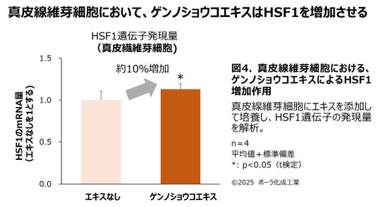 HSF1は真皮線維芽細胞ではコラーゲン産生に関わっています。実験の結果、ゲンノショウコエキスは真皮線維芽細胞においてもHSF1の増加作用があることを見出しました(図4)。