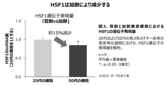 また、加齢によってHSF1が減少することも確認しており(補足資料2)、HSF1の減少が加齢に伴うバリア機能の低下と肌表面の粗さの増加に関与している可能性を見出しました。