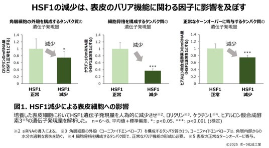 表皮でのHSF1の働きを調べるために、HSF1の遺伝子発現量を人為的に減少させたところ、肌のバリア機能に関わる因子が複数低下しました(図1)。このことから表皮では、HSF1が低下するとバリア機能が低下し、これにより肌が外部からの刺激を受けやすくなる・水分が失われやすくなるといった影響が現れ、ひいては肌の粗さにもつながると考えられます。
