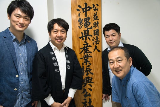 左から、バタフライピー研究所代表 王さん、スペースシードホールディングス代表の鈴木、右上 沖縄県産業振興公社経営支援部 事業支援課 新里雅樹さん、右下 沖縄県産業振興公社経営支援部 事業支援課 竹内章祝さん