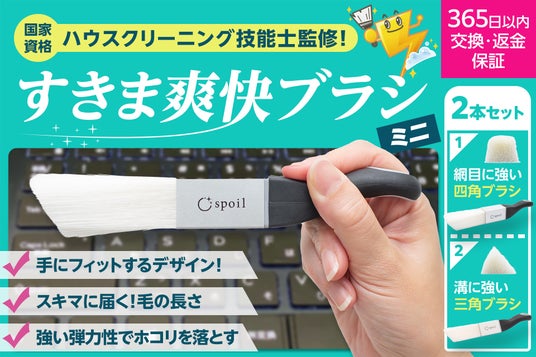 株式会社Stella Pulito63(本社:埼玉県さいたま市、代表取締役:白川英範)は、ハウスクリーニング用品ブランド「spoil (スポイル) 」より、新商品「すきま爽快 mini」を販売いたします。昨年販売した掃除用ブラシ「すきま爽快」のミニバージョンで、従来品よりさらに細かい部分の掃除がしやすくなるよう改良を施しました。なお、発売日の3月27日(木)と翌日28日(金)の2日間限定で、500円クーポンをAmazonの商品ページにて発行します。