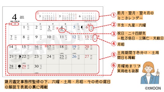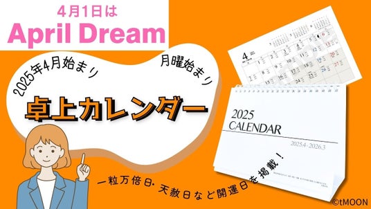 株式会社ティームーン株式会社ティームーンは、六曜・干支・九星・月相・土用・一粒万倍日・天赦日・三隣亡・二十四節気が掲載された「2025年度 4月始まり 卓上カレンダー」を数量限定で販売しています。