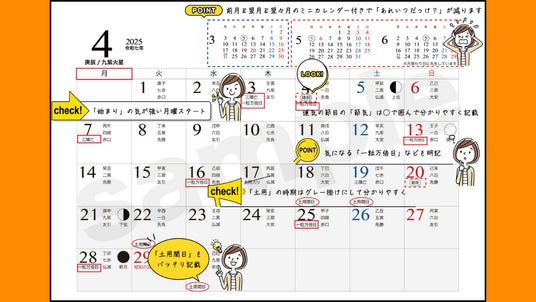 一粒万倍日や天赦日も一目でまるわかりの『2025年度 4月始まり 卓上カレンダー』は、カレンダー制作を行う「ティームーン」 と、プロの開運鑑定士である鏡月鑑定事務所の共同制作カレンダーとなります。