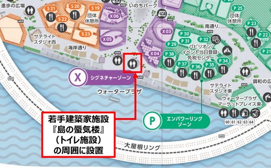 図3. 再生プラスチック配合ベンチの設置場所 (会場南端のシグネチャーゾーンに位置する『島の蜃気楼』(トイレ施設)の周辺に設置(図: 大阪・関西万博公式MAPより一部引用加筆))