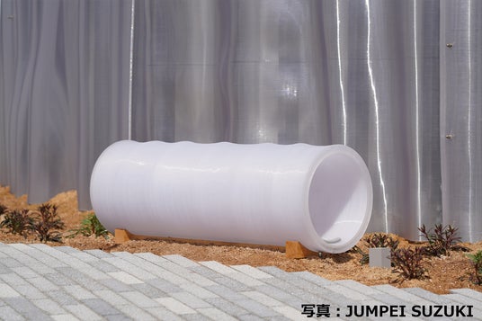大阪・関西万博では、SDGs(持続可能な開発目標)達成につながる個性豊かで魅力的な博覧会施設の創出を目指し、今後の活躍が期待される若手建築家が休憩所やトイレなど計20施設の設計を担当しています。その一つである、再利用可能な樹脂で製作され、半透明な曲線が特徴的な『島の蜃気楼』(トイレ施設)(図2、3)の周辺に、再生プラスチックを配合したベンチが設置されています。