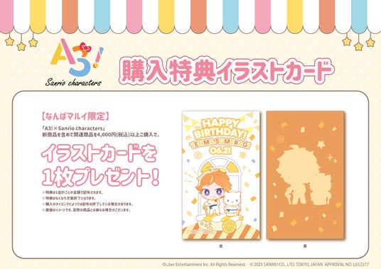「A3!×Sanrio characters」新商品を含めて関連商品を1会計4,000円(税込)以上お買い上げで、購入特典としてイラストカード(全1種)を1枚プレゼント。