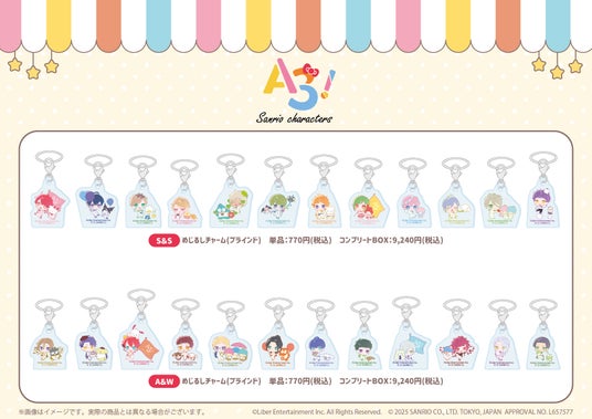 佐久間 咲也×ハローキティ/碓氷 真澄×クロミ/皆木 綴×あひるのペックル/茅ヶ崎 至×ぐでたま/シトロン×ハンギョドン/卯木 千景×ルロロマニック/皇 天馬×ディアダニエル/瑠璃川 幸×マイメロディ/向坂 椋×マイスウィートピアノ/斑鳩 三角×こぎみゅん/三好 一成×リトルツインスターズ/兵頭 九門×コロコロクリリン/摂津 万里×バッドばつ丸/兵頭 十座×ポムポムプリン/七尾 太一×ポチャッコ/伏見 臣×シュガーバニーズ/古市 左京×ゴロピカドン/泉田 莇×ウィアーダイナソアーズ!/月岡 紬×シナモロール/高遠 丞×KIRIMIちゃん./御影 密×まるもふびより/有栖川 誉×タキシードサム/雪白 東×チャーミーキティ/ガイ×けろけろけろっぴ