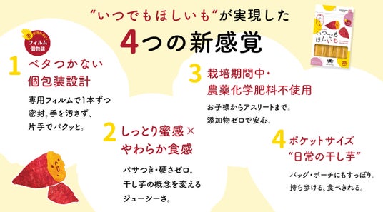 そんな「これまでになかった干し芋」を目指して、両者の想いが重なり合い、完成したのがフィルム包装で新しい食べやすさを実現した『いつでもほしいも』です。