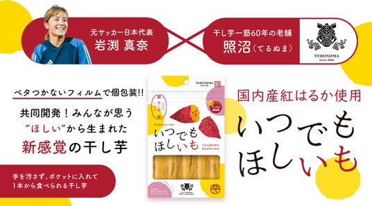 大の干し芋ファンである元サッカー日本代表・岩渕真奈さんと、創業60年以上の歴史を誇る有機干し芋の老舗ブランド照沼(てるぬま)が新感覚の干し芋『いつでもほしいも』を共同開発しました。