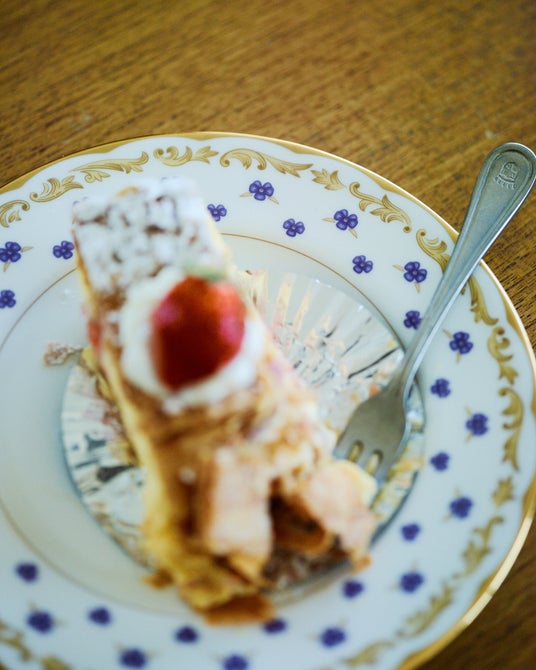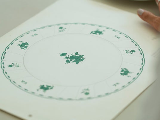 残っていた当時の資料はプレートの原画一枚のみのため、カップとケーキ皿の型に合わせて配置や大きさを細やかに調整。カップは原画が存在しないため、余白が気になる部分にオリジナルのモチーフを加え、実際にカップに貼り付けバランスを確かめながら緻密にデザインを施しました。