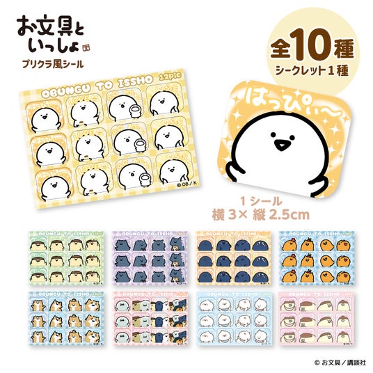 お文具さんといっしょ プリクラ風シール 全10種:BOX 6,160円、単品 616円(税込)色々な表情をしたお文具さんたちがかわいいプリクラ風シール!手帳やスマホに貼って、毎日をもっとハッピーにしちゃおう。