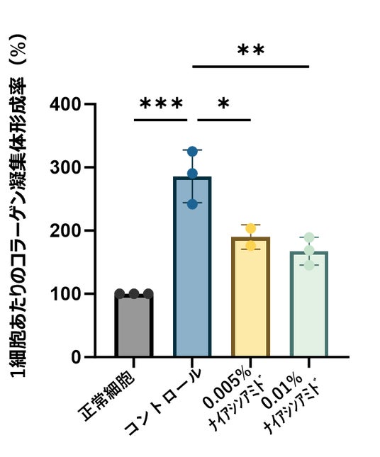 化粧品に広く使用されている成分であるナイアシンアミドが、老化細胞内に蓄積したコラーゲン凝集体を減少させることが分かりました(図2)。これは、ナイアシンアミドが肌に対して抗老化作用を発揮する新たなメカニズムを示しています。