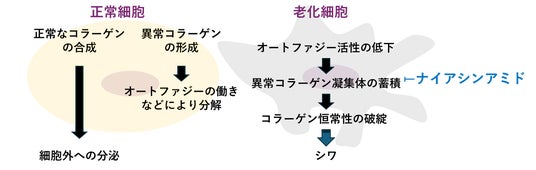 図1:老化細胞における異常コラーゲンの蓄積と、ナイアシンアミドの異常コラーゲン除去作用