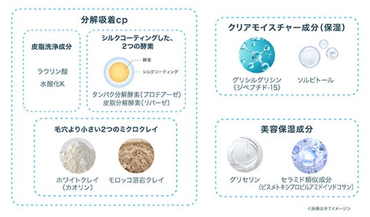 ●2つの酵素*³と2つのミクロクレイ*⁴、皮脂洗浄成分*⁵から成る分解吸着洗浄cp(洗浄成分)配合。