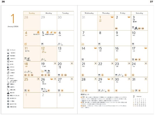 「木下レオン流 開運手帳」では、29種類もの開運日と、毎日の月齢(新月~満月の月の満ち欠け)を網羅しました。今日、今週、今月を、どのような流れで過ごせば天の後押しが得られるのか、手帳を開けば一目瞭然です。