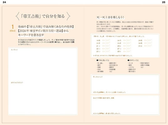 書くことが“氣のチューニング”になり、開運行動になります。1月から12月まで、無理なく自分の本音を引き出し、感情をまるごと愛せるようなワークのページを設けてあります。少しずつ内面の氣が整ってくる感覚を楽しんでいただけます。
