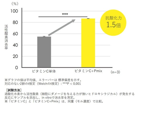 ※1:ビタミンC単体と「ビタミンC+Pmix」の抗酸化力の比較