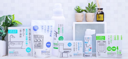 「エコメイト」は、掃除する場所・汚れの種類に応じて最適な成分を配合した、用途別の家庭用洗浄剤シリーズです。洗浄成分は天然由来成分のみを原料としており、石けん以外の洗浄成分も、水に溶けると酸素と水に分解される酸素系漂白剤や、酸性の汚れを中和して落としやすくする鉱物由来のアルカリ剤など、すべての商品で、生分解性※2の高さや環境負荷の低さにこだわって成分を配合しています。