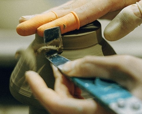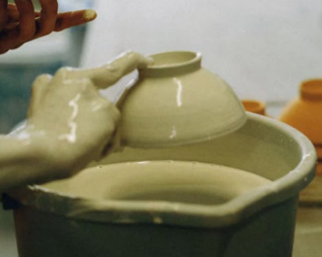 採掘した土を整え、ろくろで成形。手作業で測りながら、茶碗を次々と仕上げる