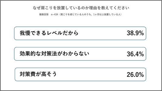 1ヶ月以上放置している人を対象に理由も聞いたところ、1位は「我慢できるレベルだから」で38.9%、2位は「効果的な対策法がわからない」で36.4%、3位は「対策費が高そう」で26.0%という結果に。日常的に肩こりを感じる人が多い一方で、耐えられる不調と認識され、方法や費用の壁から対策が先送りになっていると考えられます。
