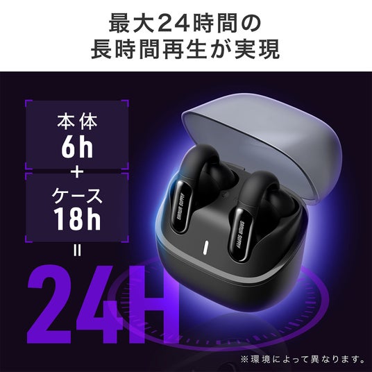 本体の連続再生は最大6時間。充電ケースを併用すれば合計24時間の長時間使用が可能です。さらに、10分の充電で0%から約50%の急速チャージに対応。通勤前や外出前でもすぐに使える安心設計です。透け感のあるケースデザインで、収納状態も一目で確認できます。