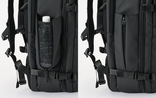 - 側面には、ペットボトルなどの収納に便利なオープンポケット付き。使わないときはファスナーを閉じて、ポケットを目立たなくできます。